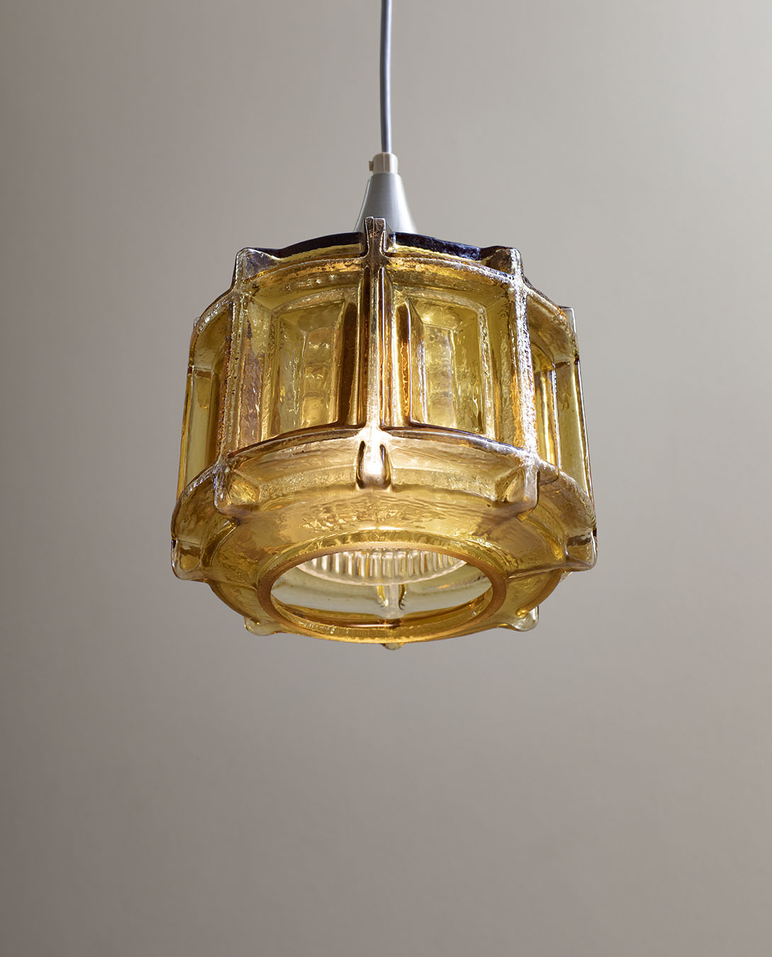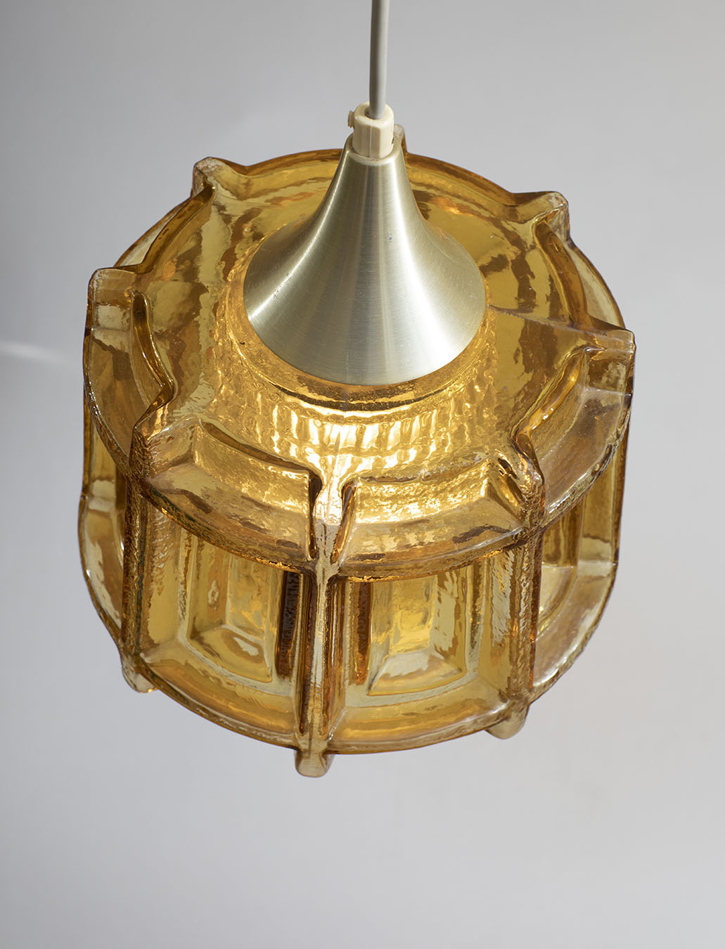 Szklany oktagonalny klosz, metalowy element wyprowadzający kabel. Jedno źródło światła. Żarówka gwint E27. Stan bardzo dobry.