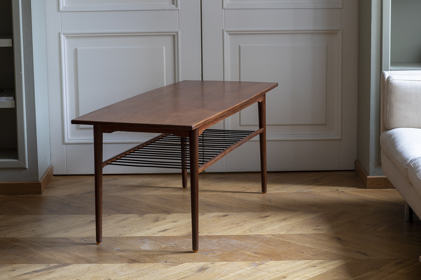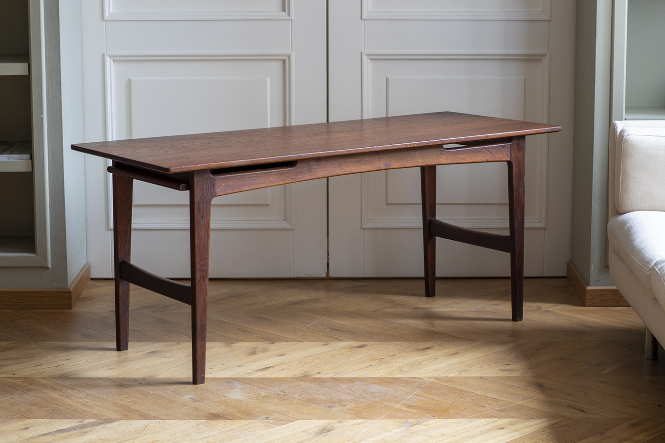 Description Teak coffee table, restored. Main top complemented by a pull-out side leaf, extending the usable surface. Stable construction. Wood cleaned and finished with oil, with natural patina preserved.