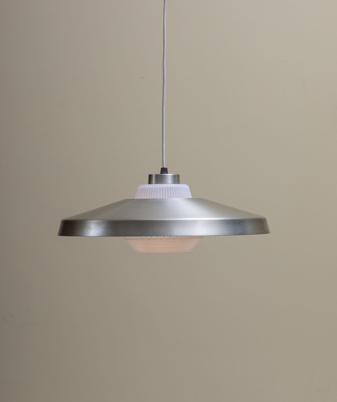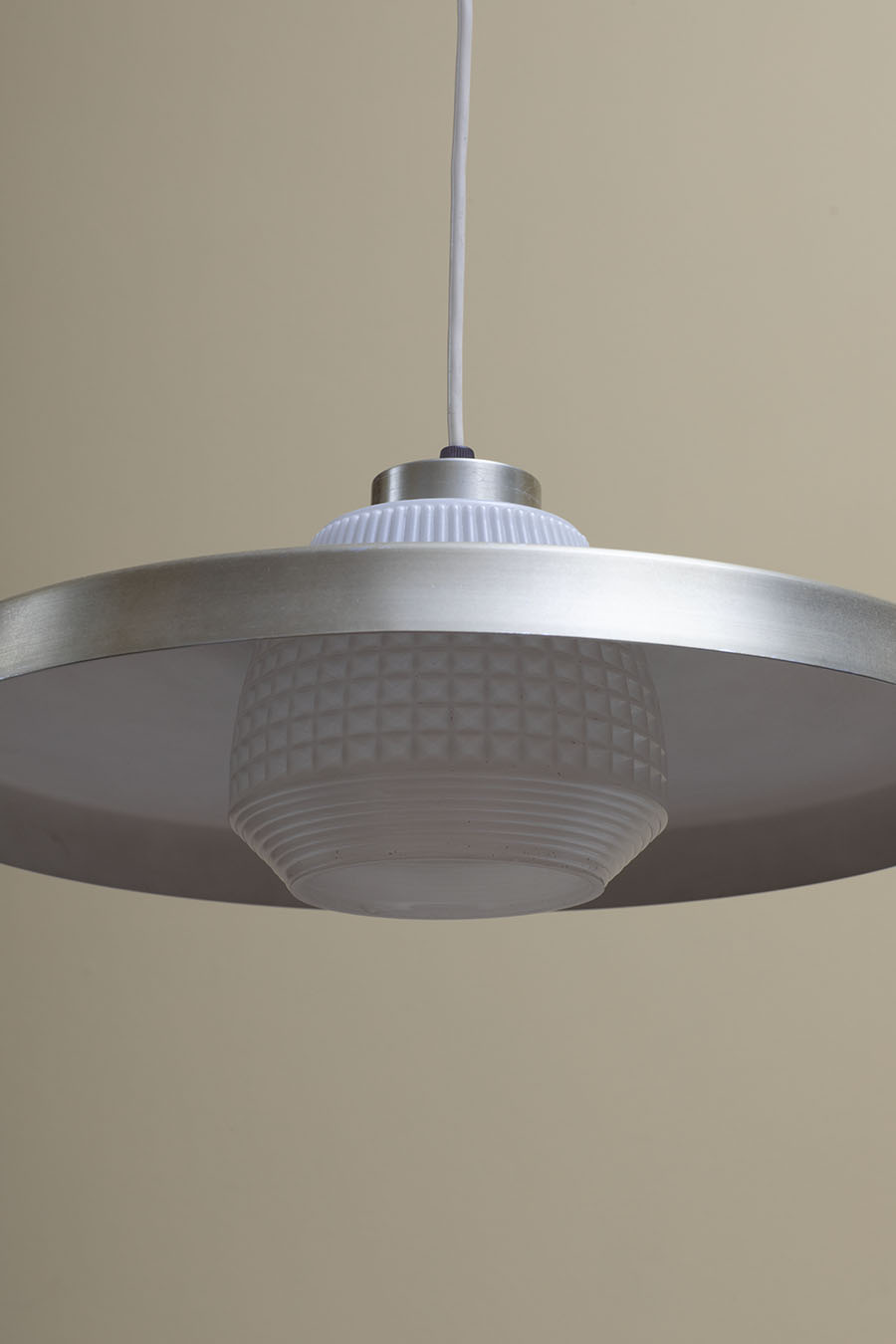 Vintage lamp. A metal plate resting on an opaline glass shade, made of pressed, embossed glass. Light sources: E27 socket bulb. Strong patina – two clear scratches on the upper part of the plate.