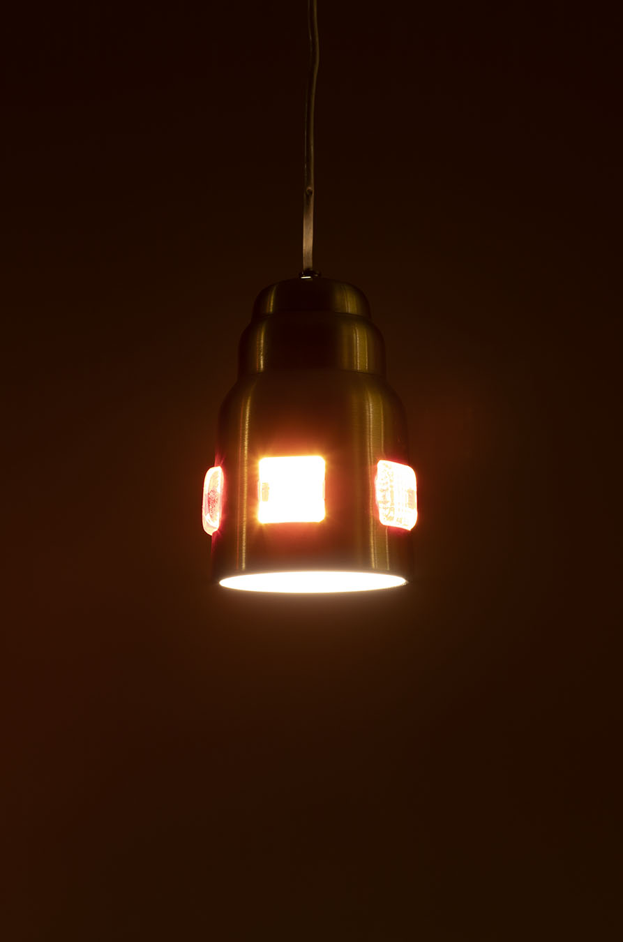 Aluminum vintage lamp in gold color, glass elements. One light source, E27 socket bulb. Very good condition, appropriate to the age of the item.