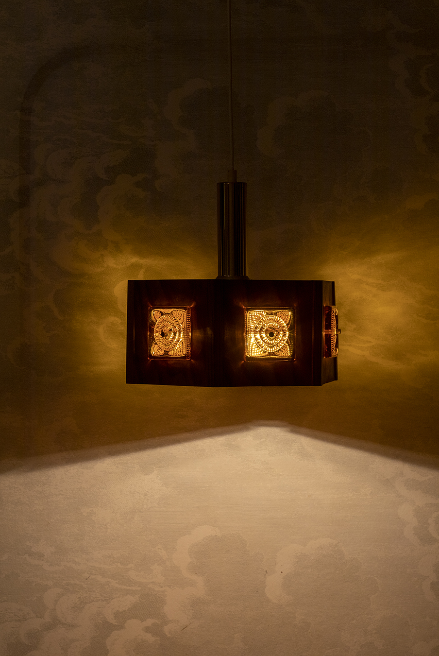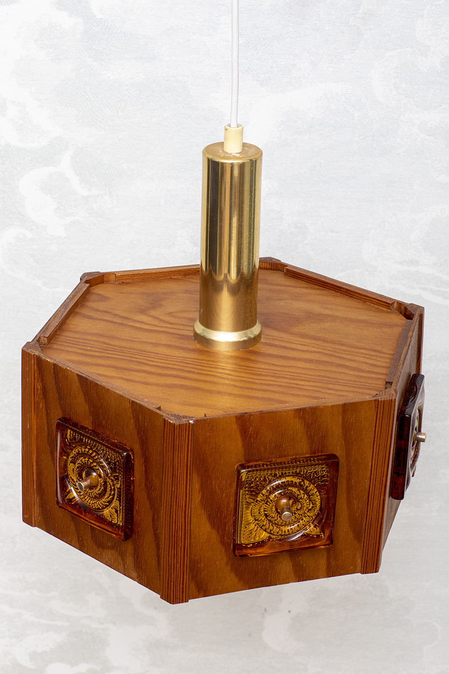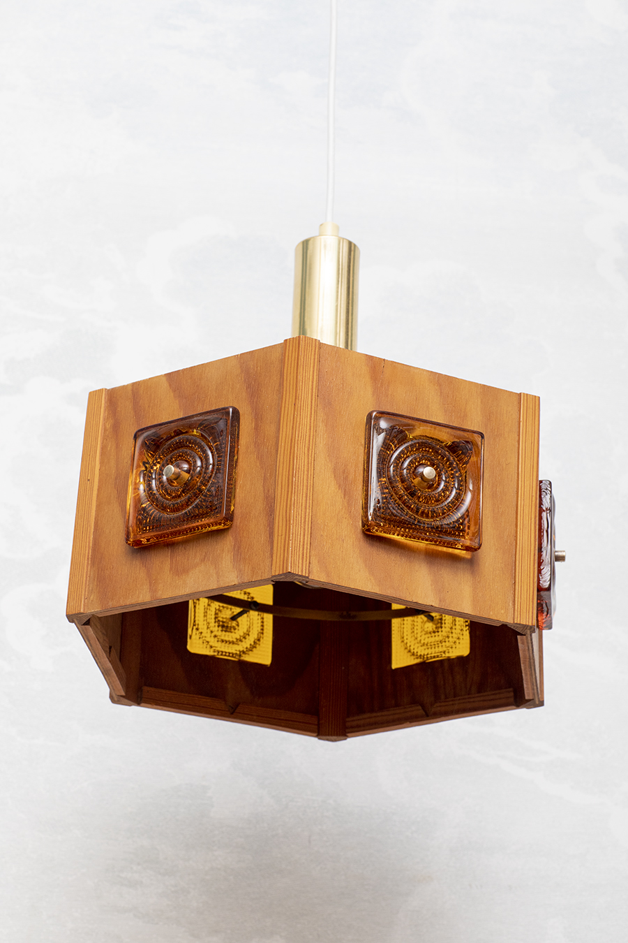 Pendant lamp with a wooden structure, combined with decorative amber-colored glass elements. Brass ceiling fitting.