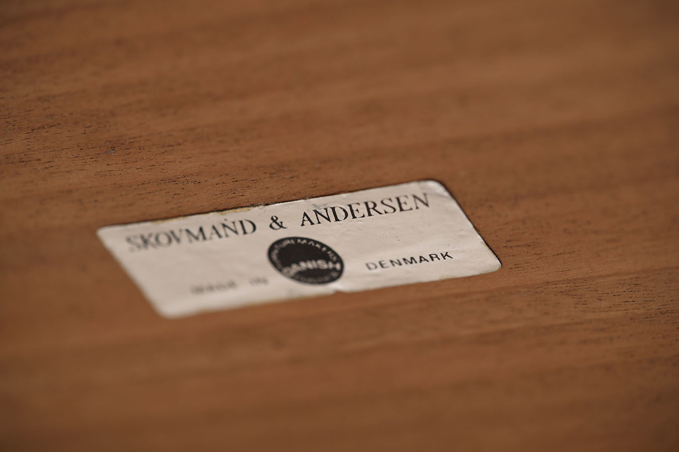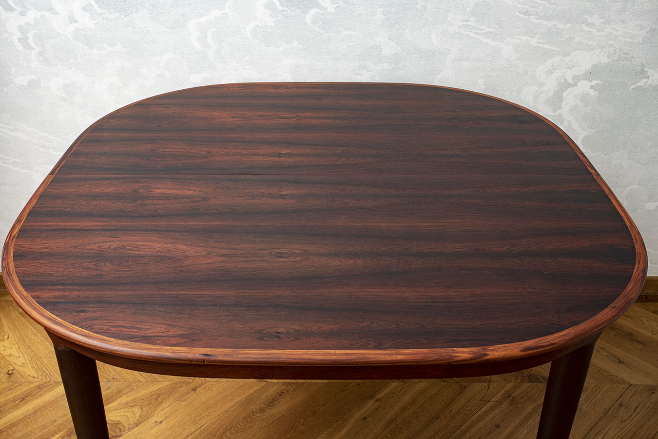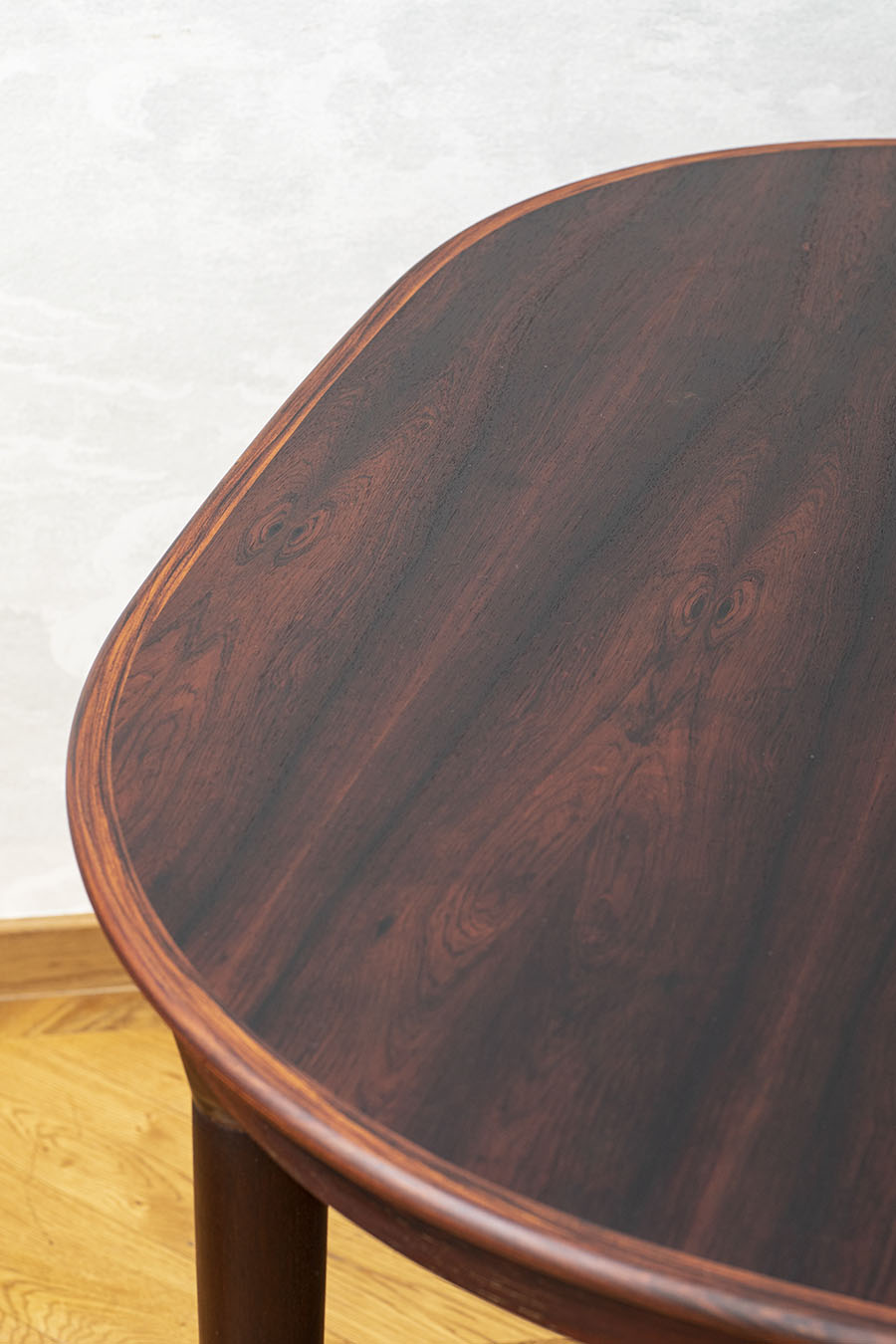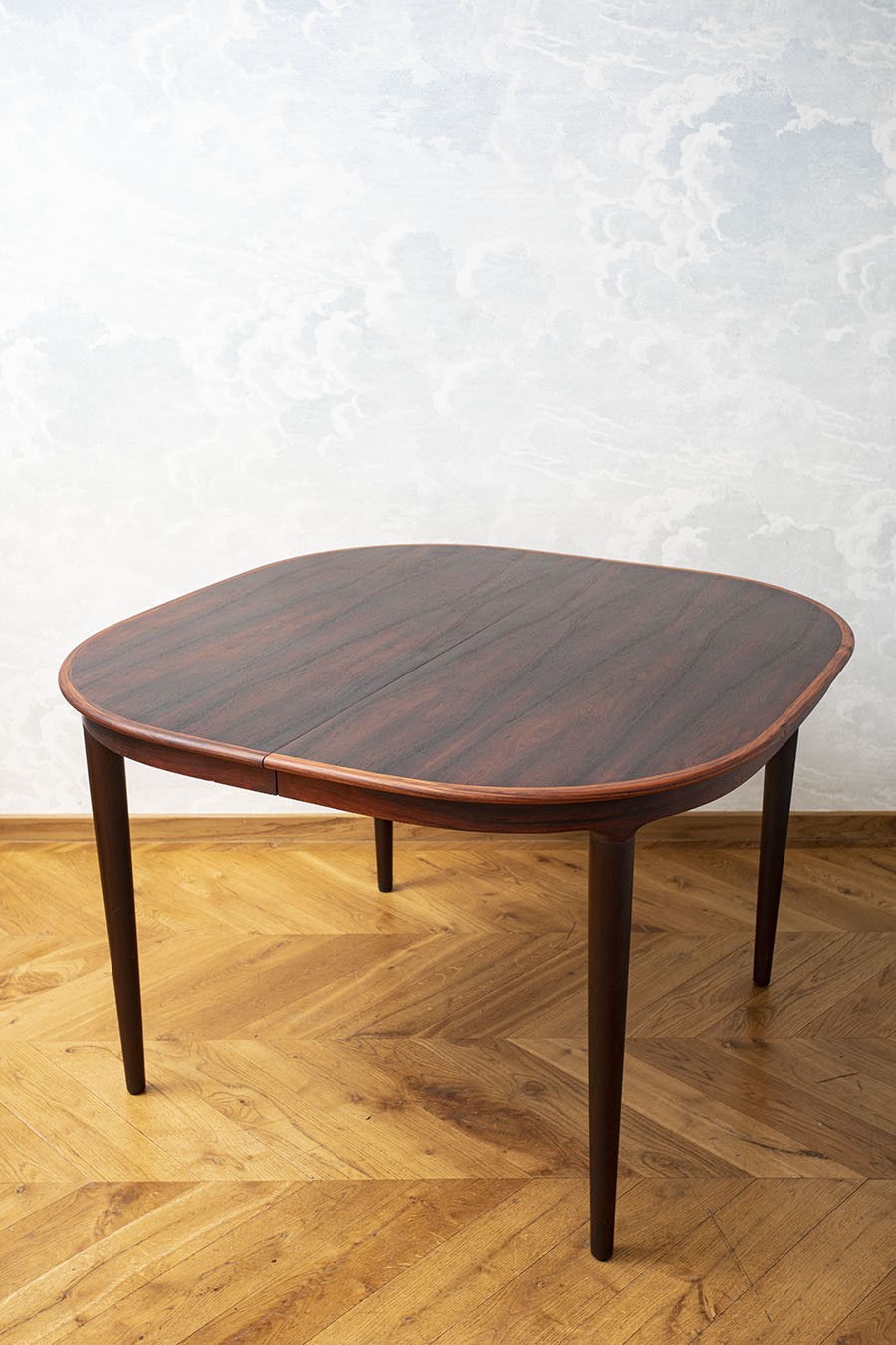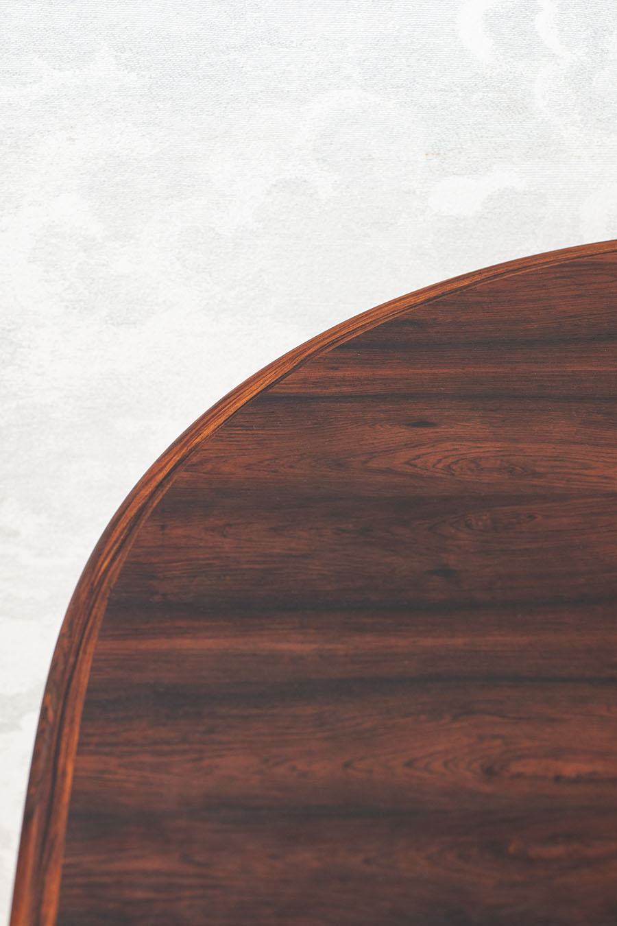 Rosewood table from the 60’s, by Skovmand & Andersen. The legs and the rim both made of rosewood . The top covered with rosewood veneer. Refurbished. Old layer of varnish remowed, and the new one in matte finish put on.