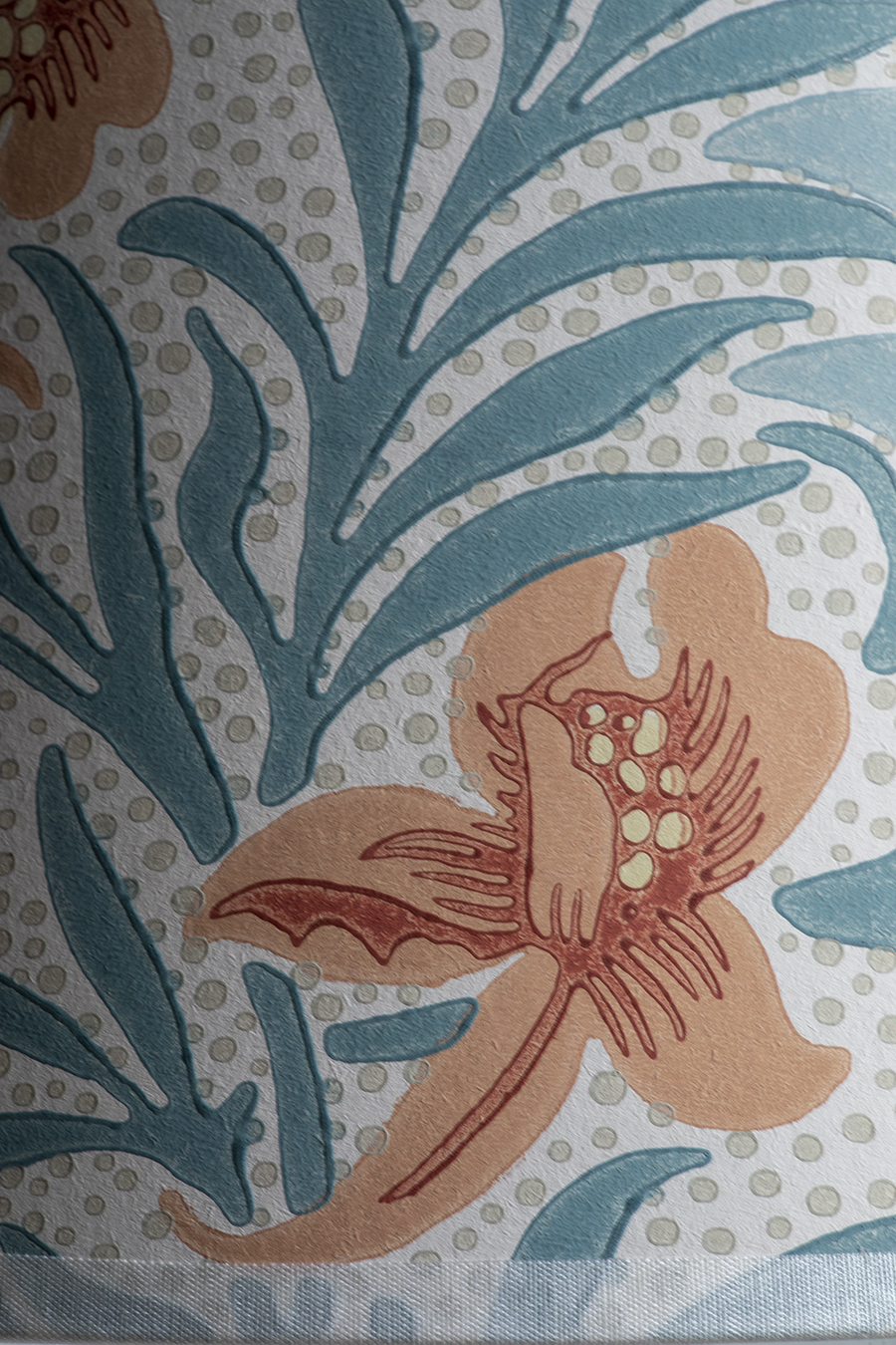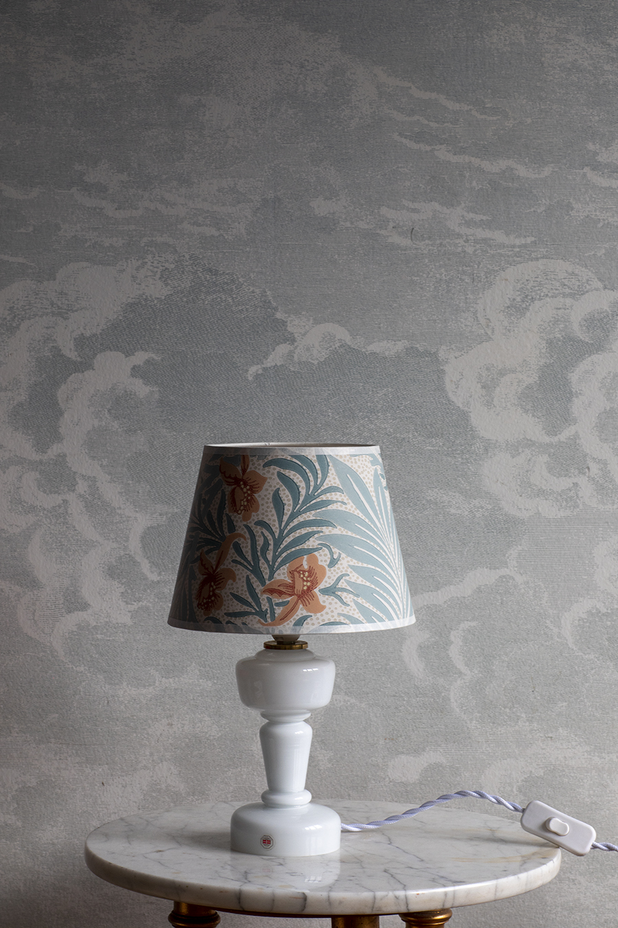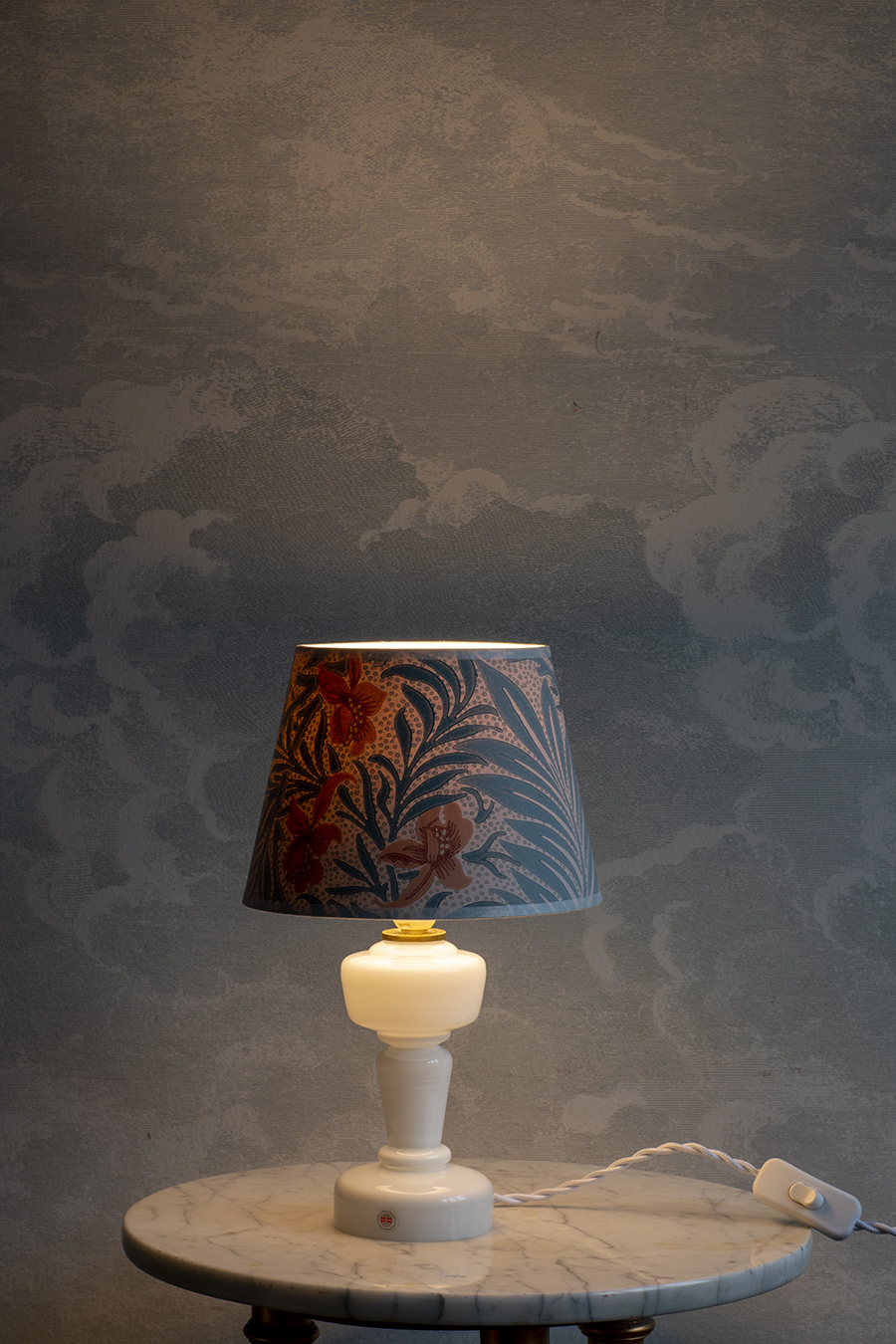 Szkło mleczne. Zachowana oryginalna naklejka producenta. Abażur wykonany współcześnie przez rzemieślnika z ręcznie malowanej tapety.