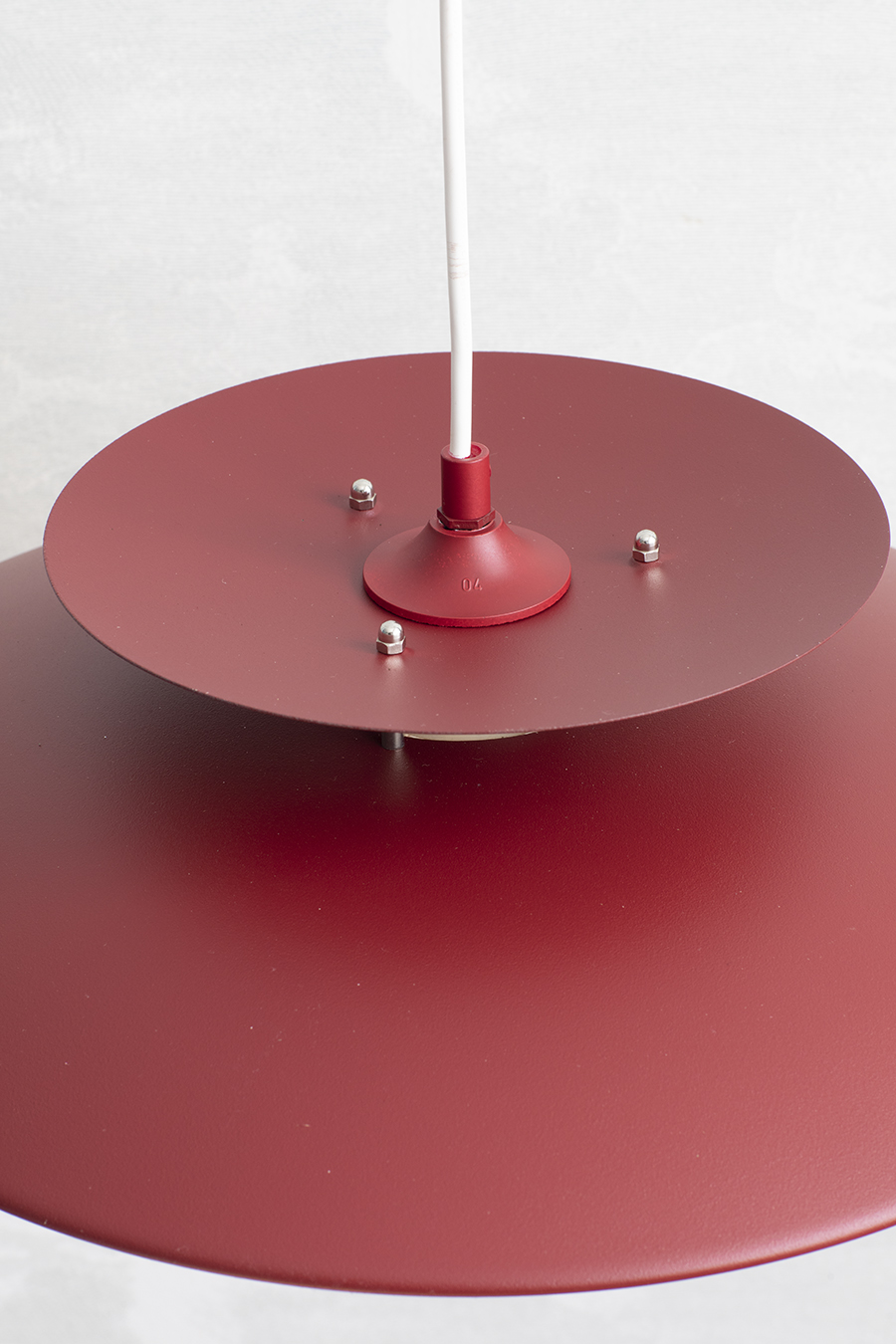 Metal lakierowany w kolorze burgundowym. Forma wielopoziomowa, typowa dla skandynawskiego modernizmu.