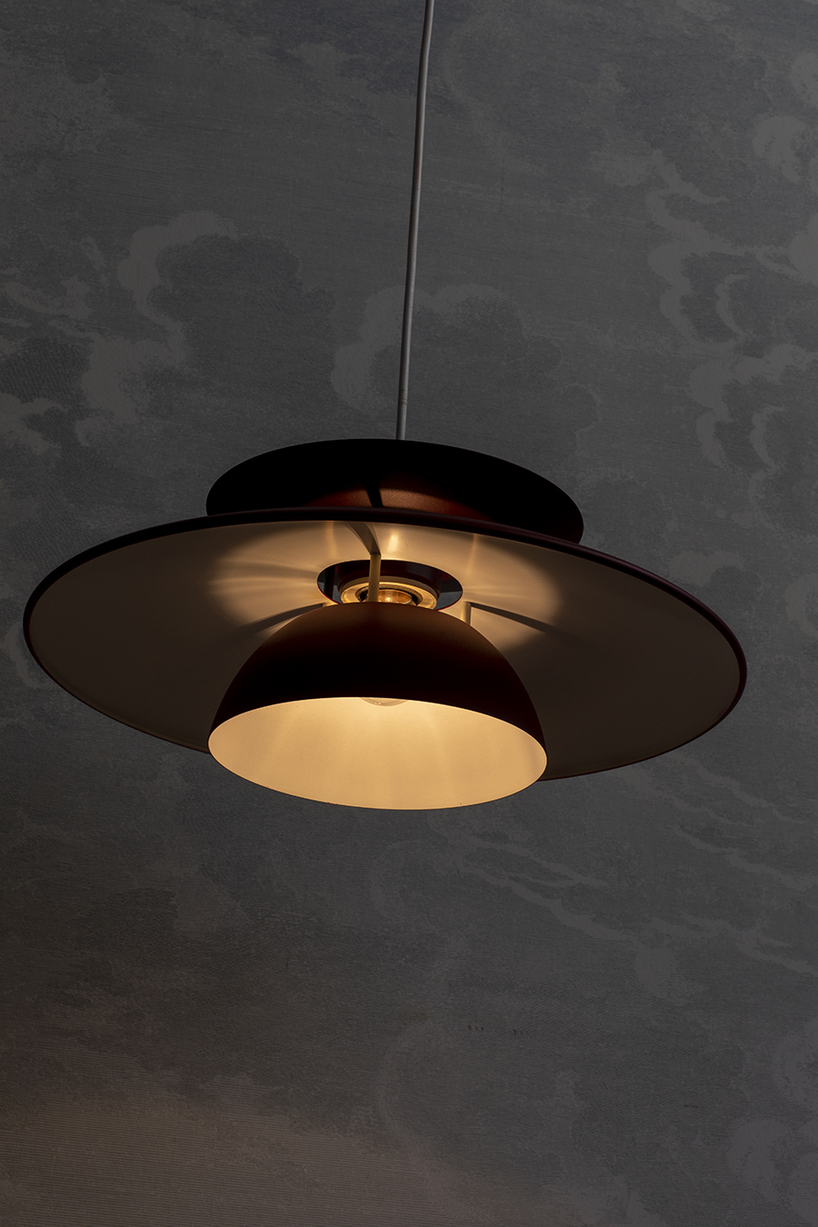 Lampa o rozłożystym kloszu z trzema talerzowymi elementami, zapewniającymi miękkie, rozproszone światło. Kolor głęboki, matowy. Konstrukcja lekka wizualnie, proporcje wyważone.