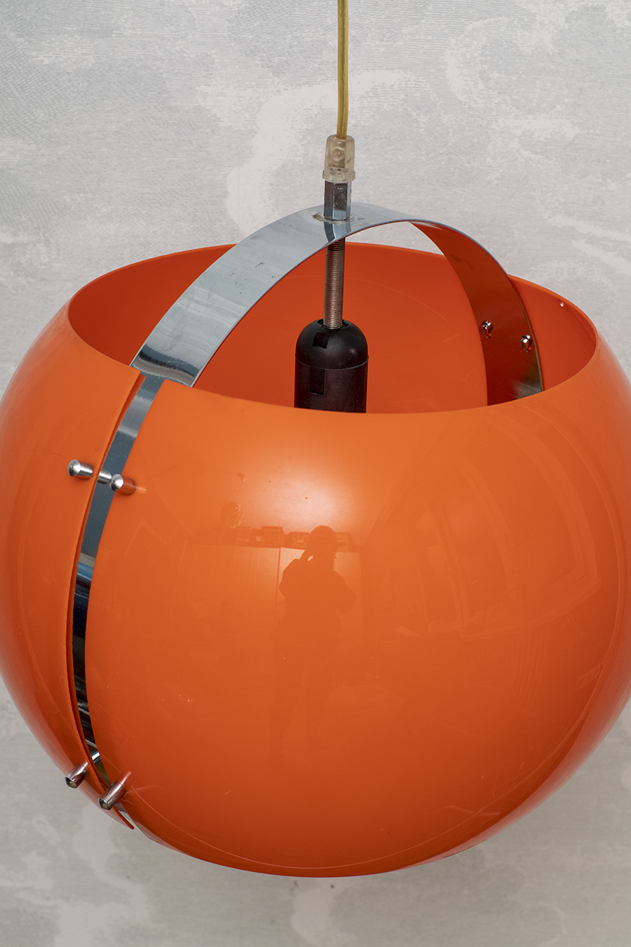 Plastik w kolorze pomarańczowym. Metalowa obręcz. Oprawka E27. Elektryka po przeglądzie.