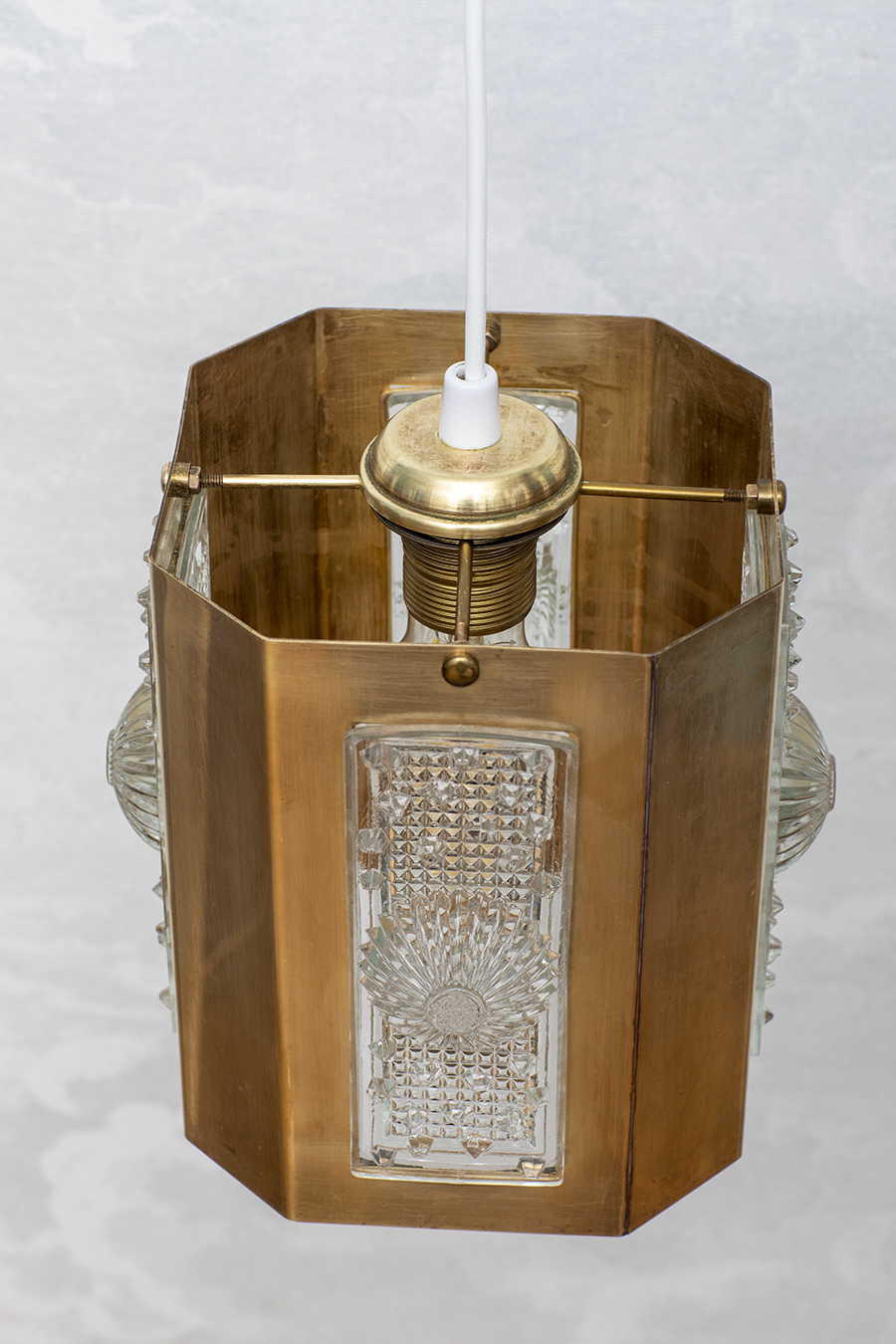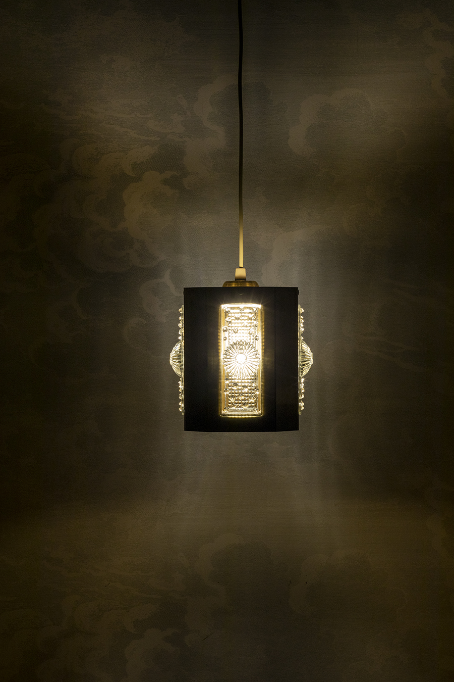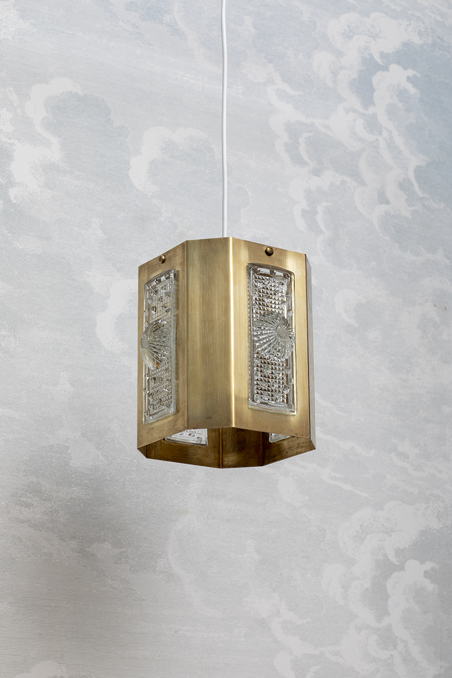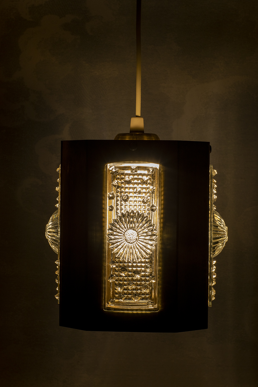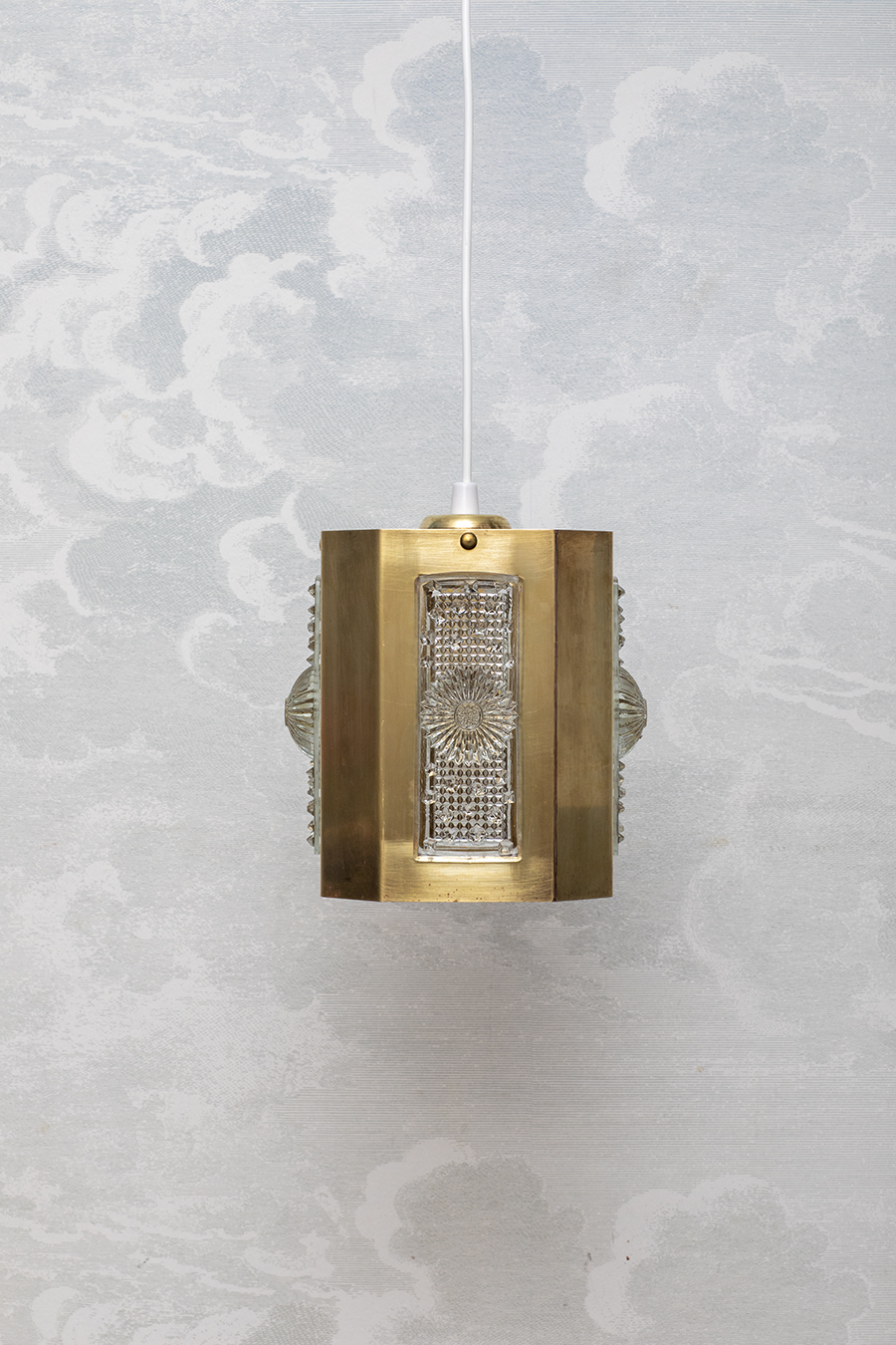 Kompaktowa, geometryczna forma. Mosiężny korpus zestawiony z tłoczonymi, transparentnymi elementami szklanymi. Światło rozpraszane przez fakturowane szkło daje miękki efekt. Oprawka na żarówkę E27.