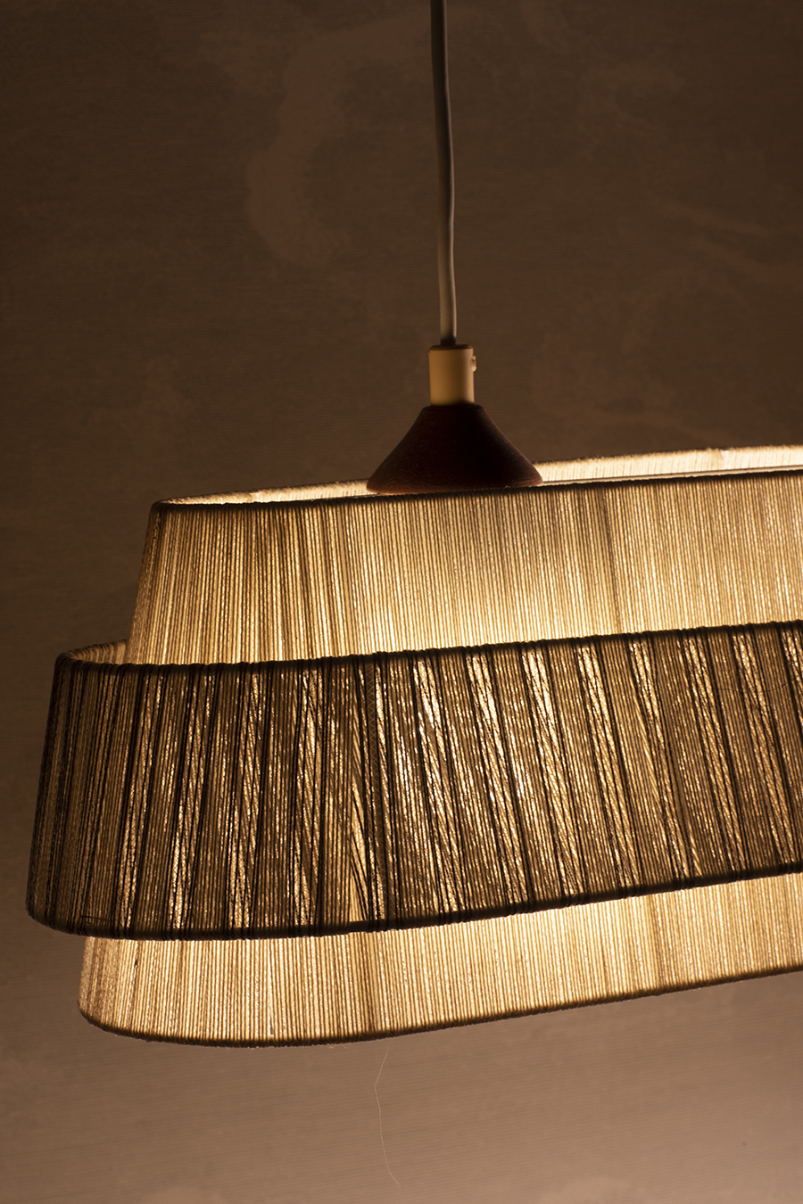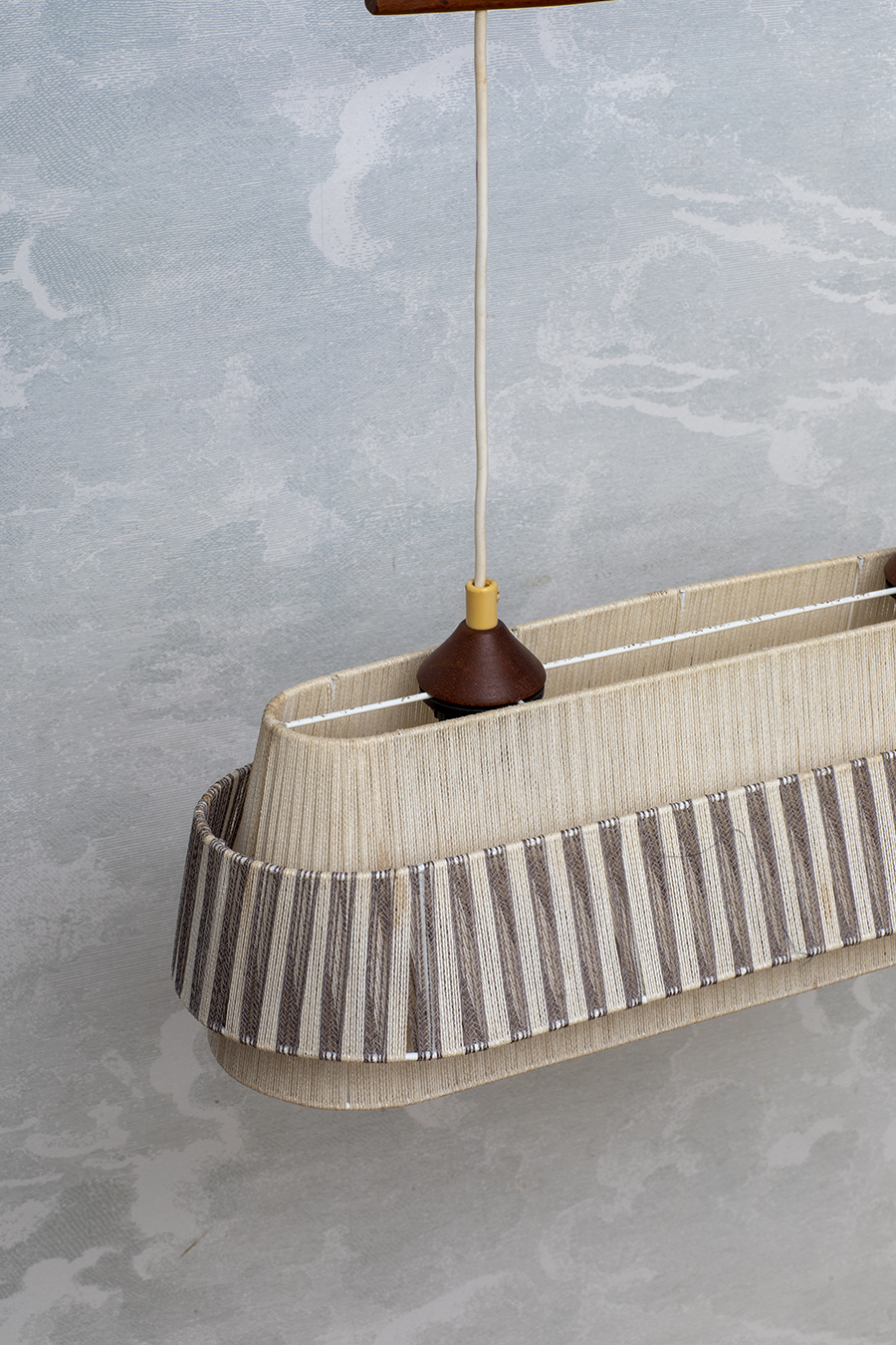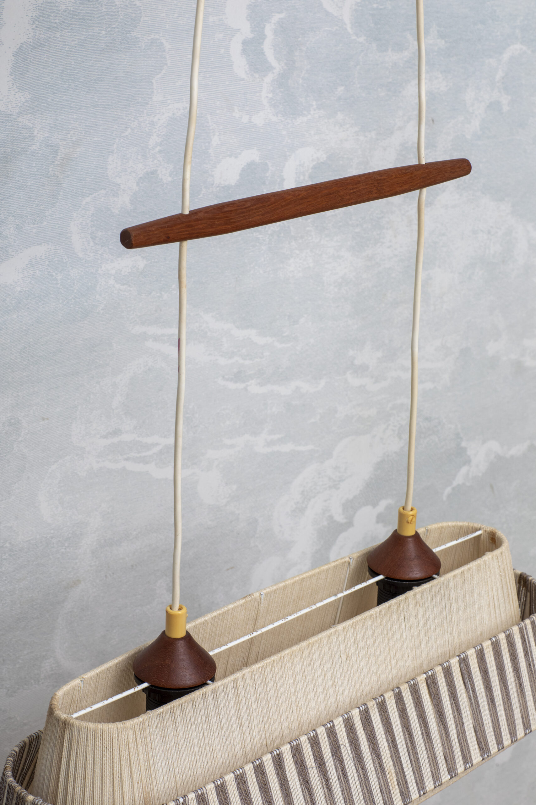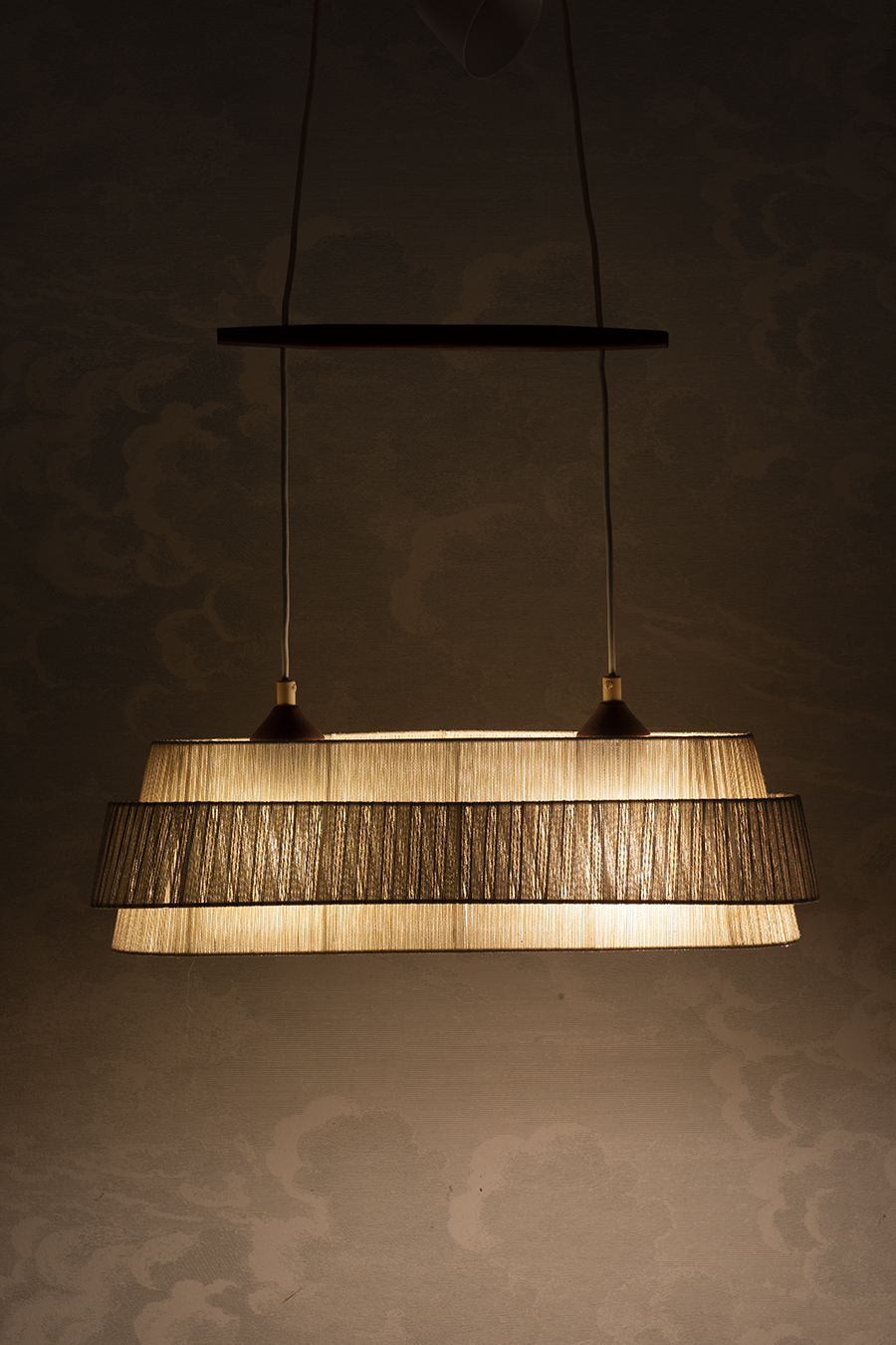 Podłużna forma z dwoma punktami świetlnymi. Abażur wykonany z tkaniny, zestawiony z elementami z drewna tekowego. Światło rozproszone, miękkie. Oprawki na dwie żarówki E27.