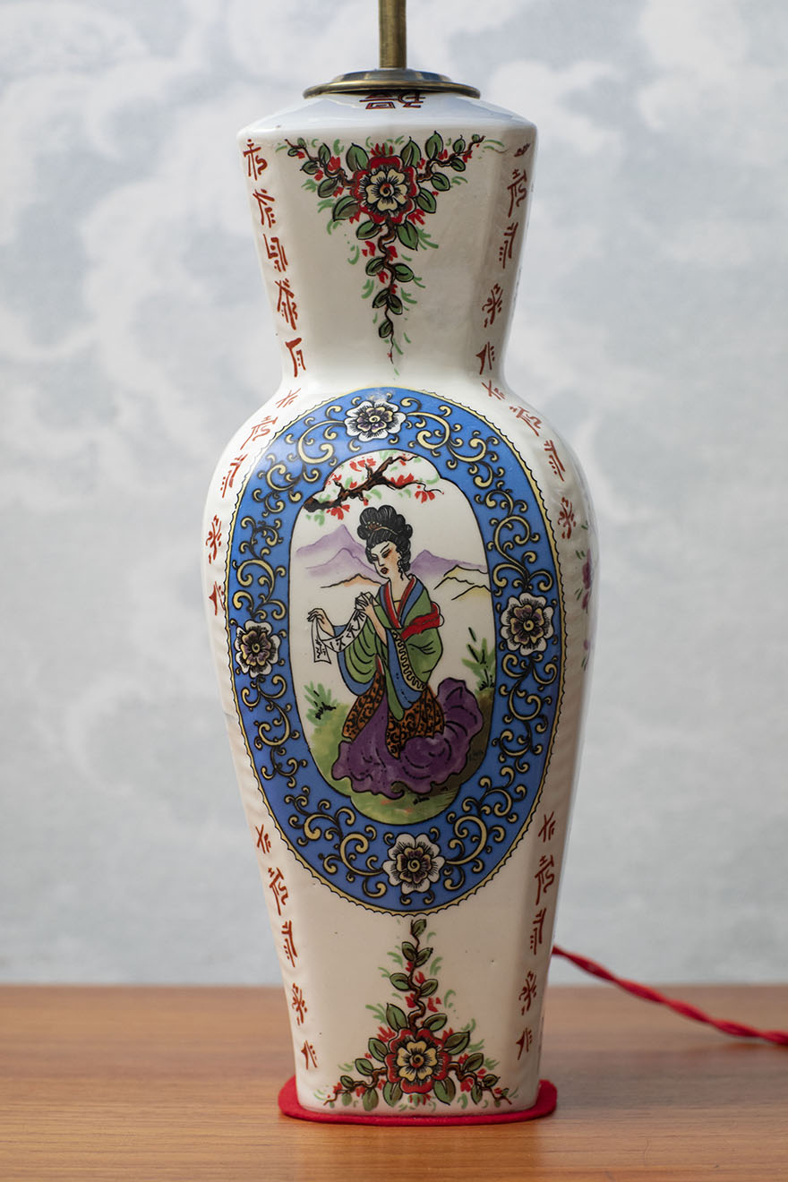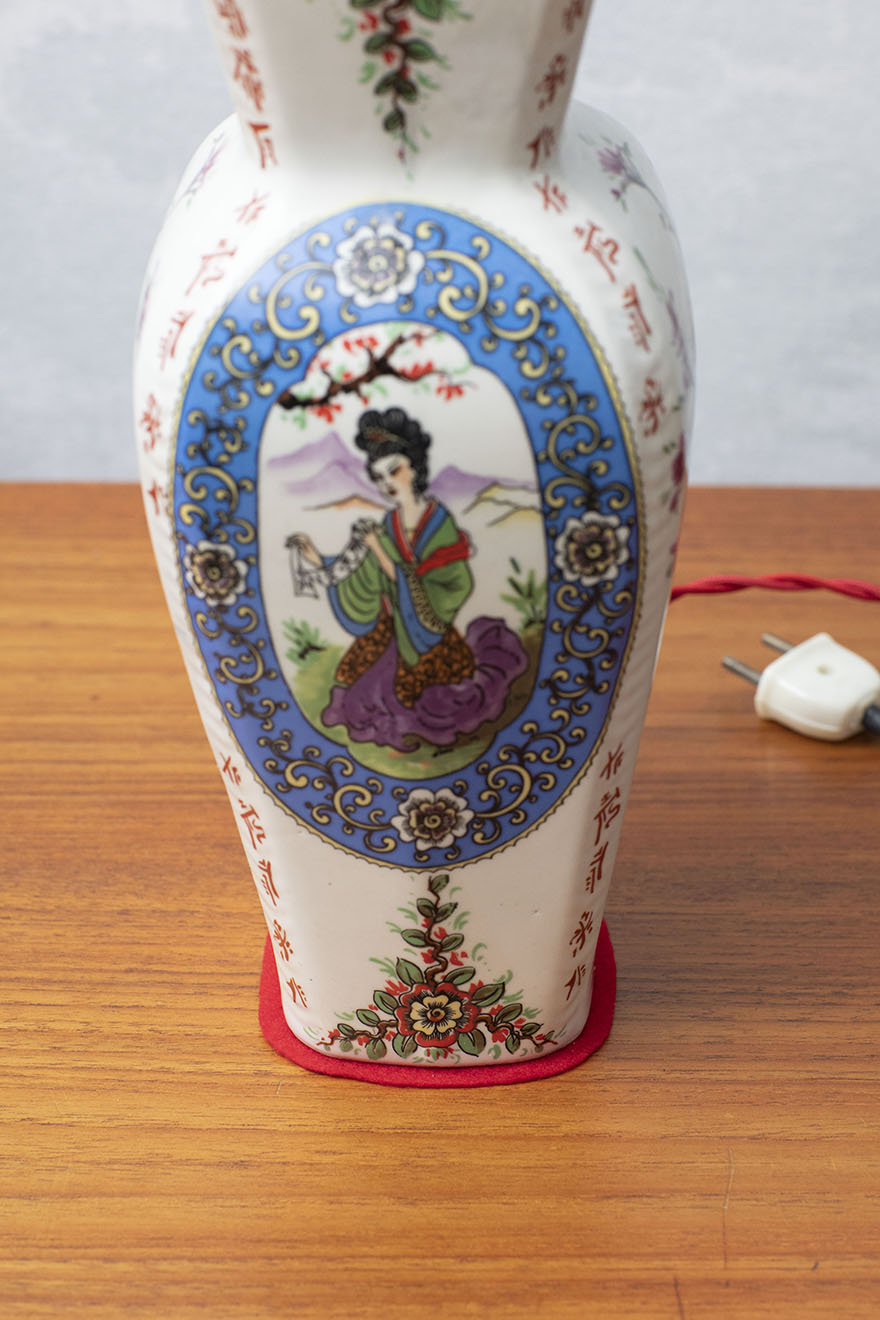 Porcelanowa lampa ze wschodnim motywem. Abażur jest jedwabny. Elektryka w lampie jest wymieniona na nową.