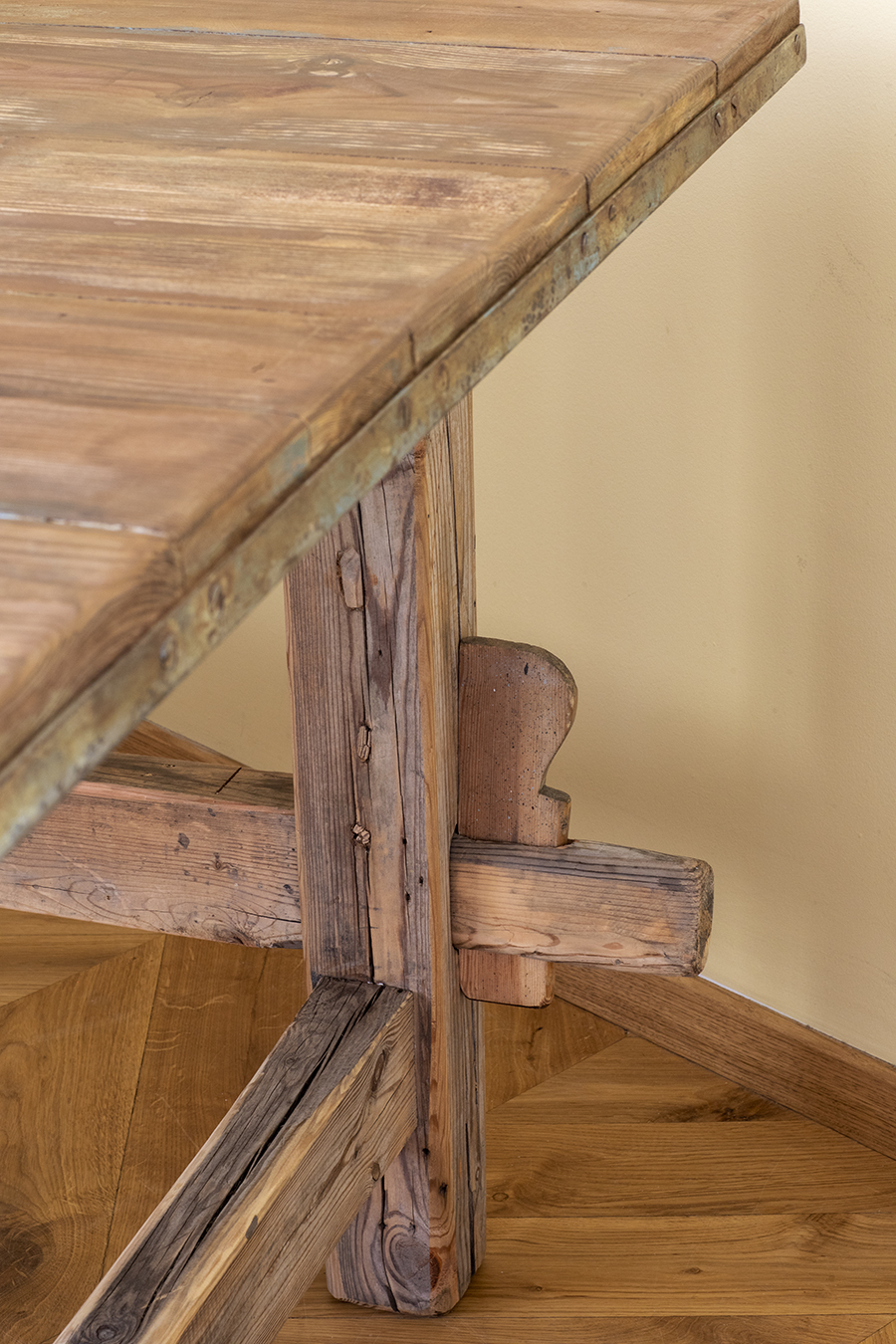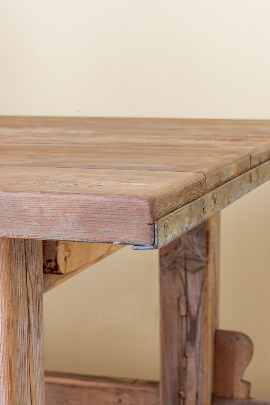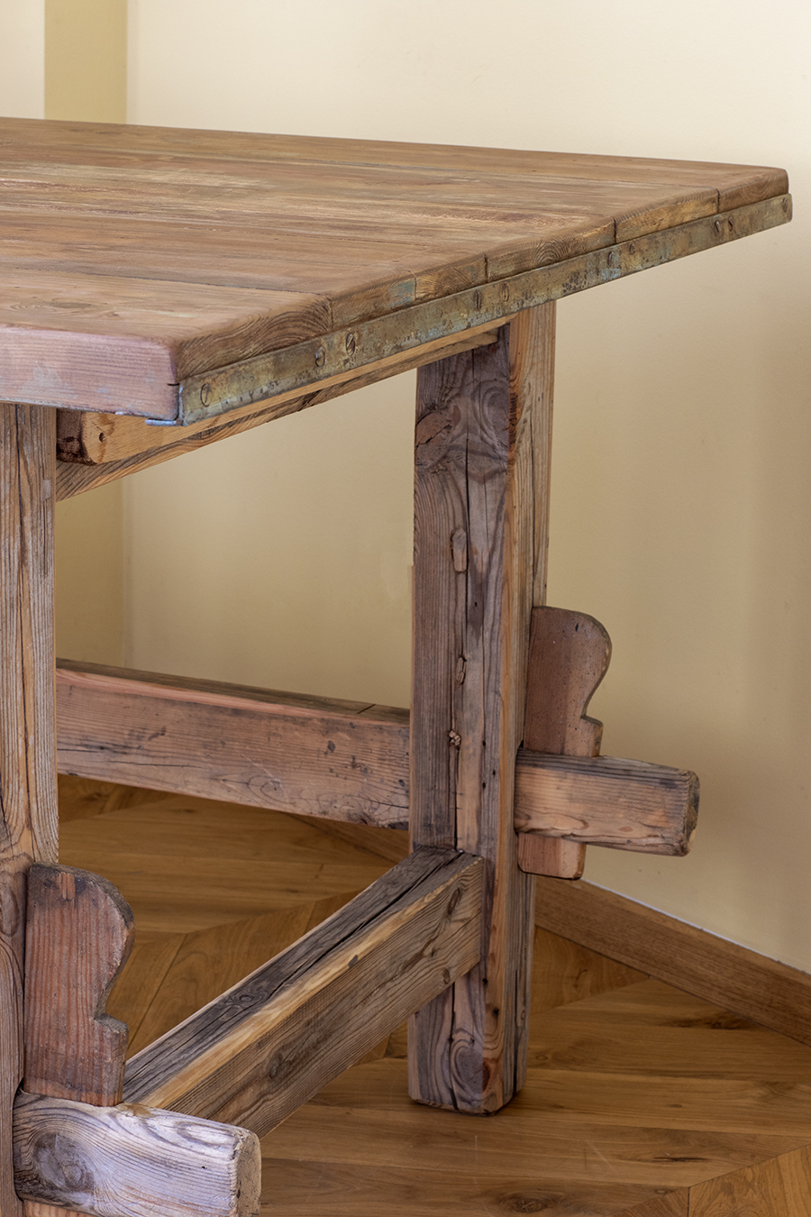 Stół z litego drewna o prostej, surowej formie. Konstrukcja stabilna, oparta na masywnych nogach z poprzecznymi łączeniami. Blat o wyraźnym rysunku drewna, zachowana naturalna patyna.
