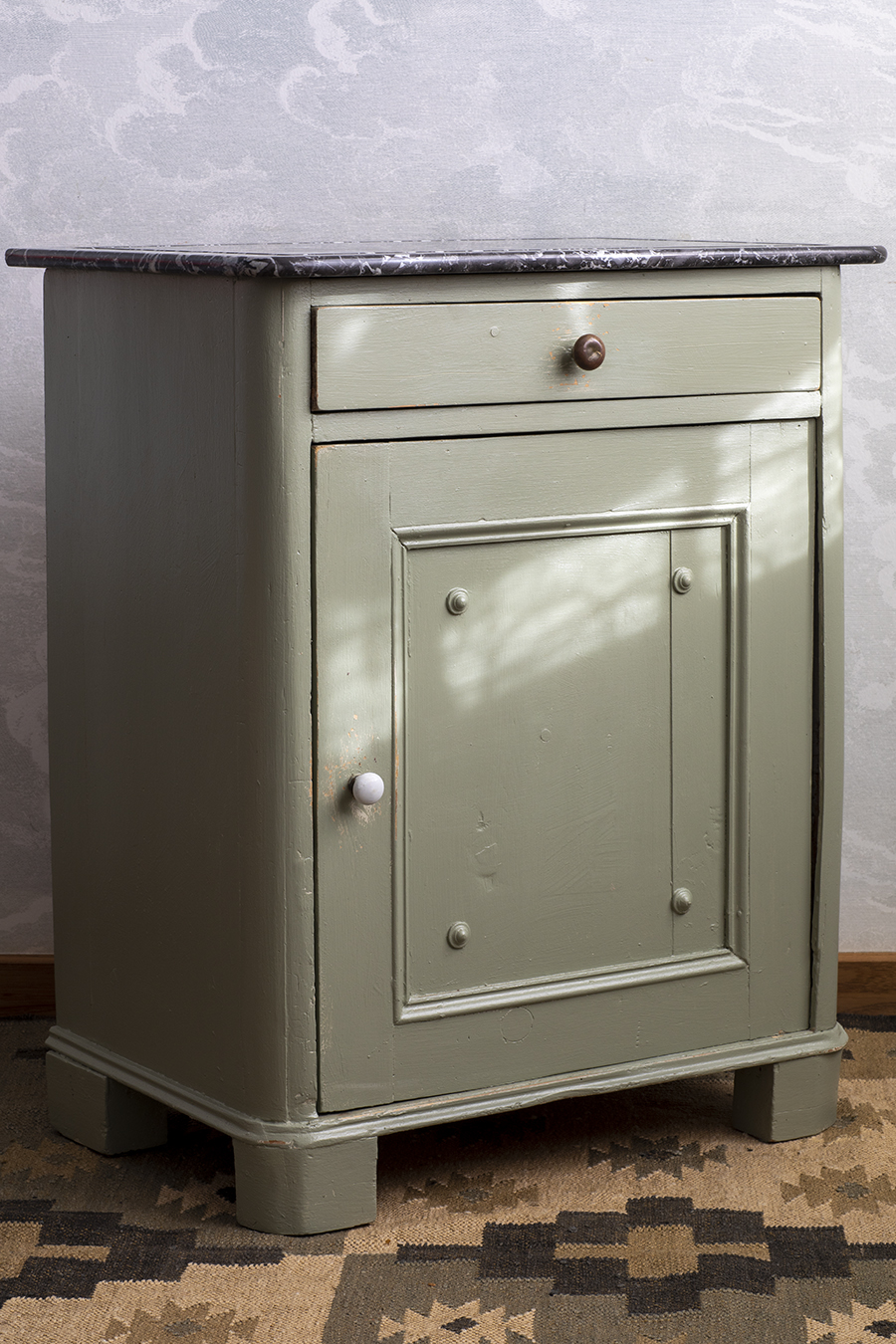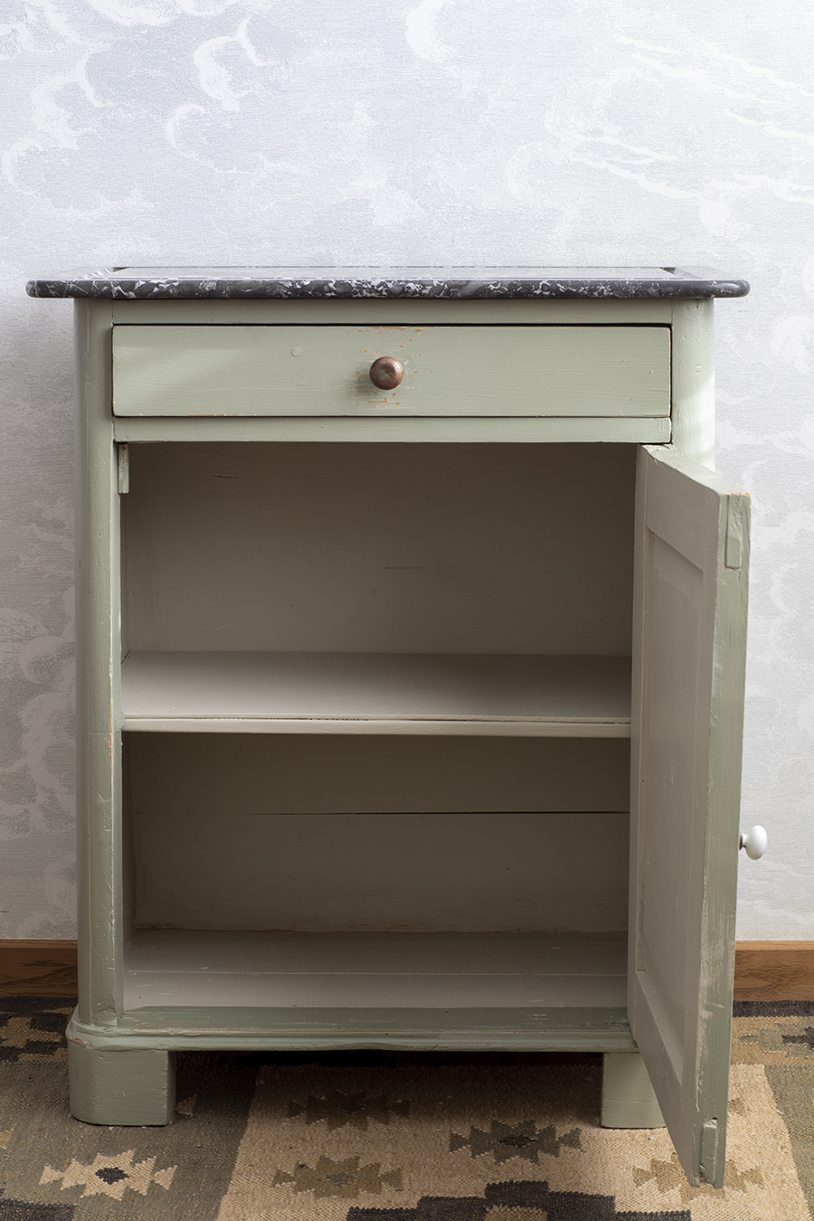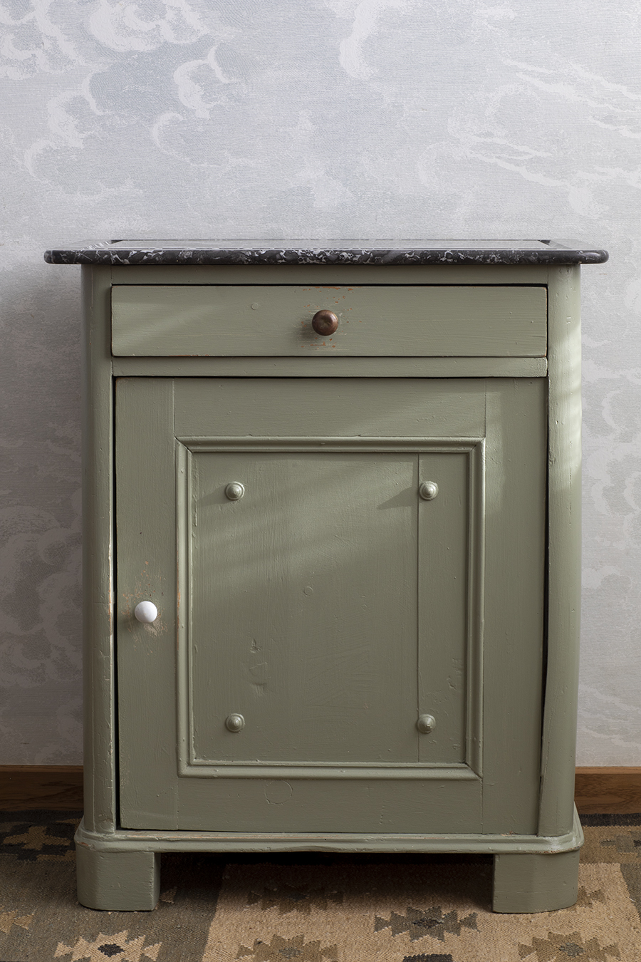 Szafka vintage z kamiennym blatem. Korpus z jedną szufladą oraz szafką z półką wewnątrz.