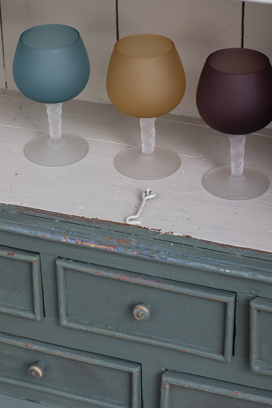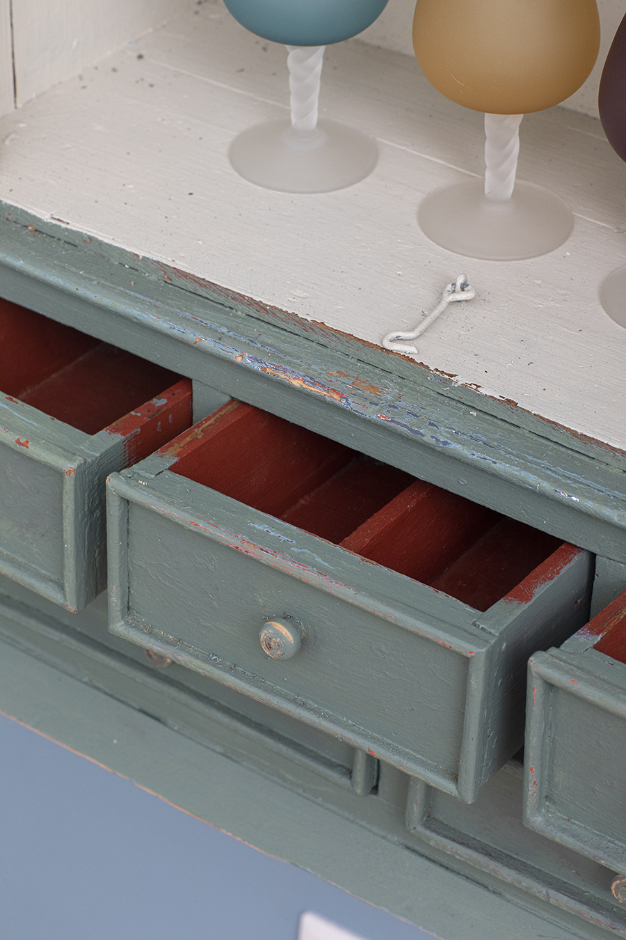 Drewno, po renowacji. Powierzchnia malowana i celowo spatynowana. Zewnętrzna kolorystyka szarozielona, wnętrze w odcieniu śmietankowym.