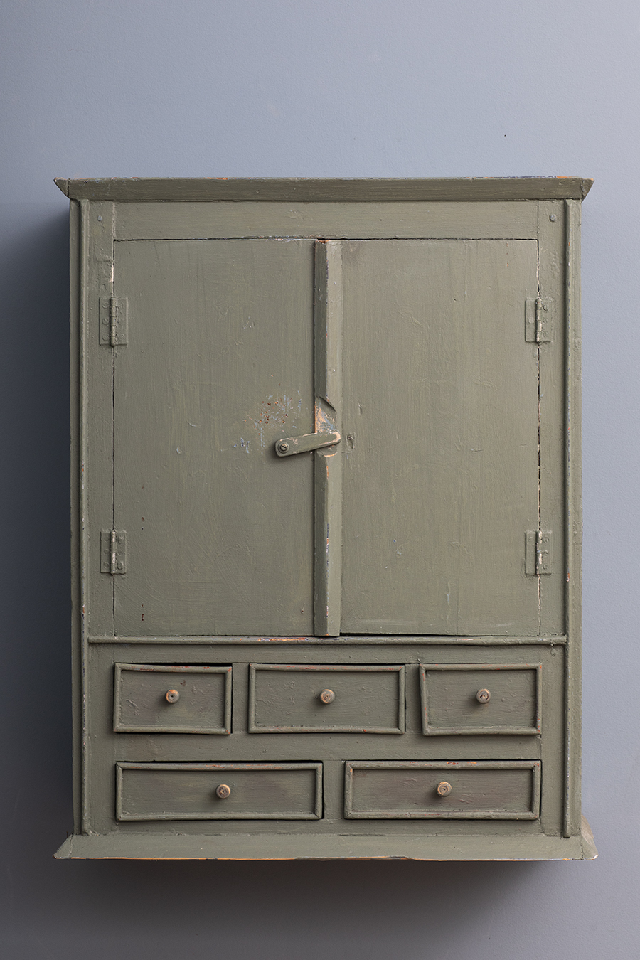 Szafka o prostej, użytkowej formie z podwójnymi drzwiczkami i szufladami. Widoczne przetarcia i patyna podkreślają charakter przedmiotu. Wnętrze z półką. Konstrukcja przygotowana do montażu ściennego – dwa metalowe uchwyty do zawieszenia.