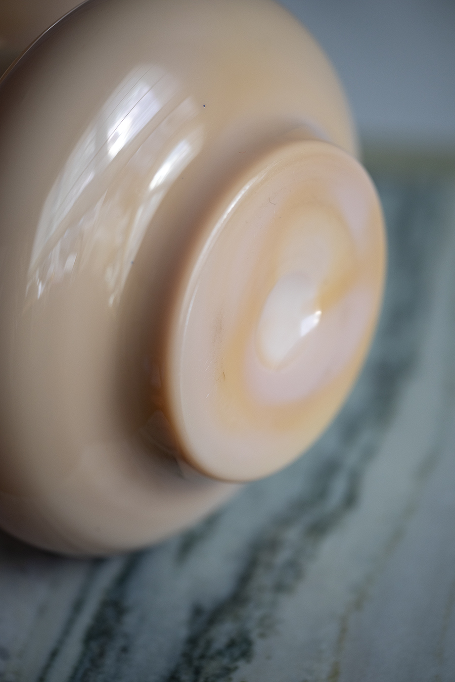 Polska produkcja. Projekt Lucyny Pijaczewskiej. Szkło barwione w masie w odcieniu pudrowego różu. Forma o rozszerzającej się szyi i pierścieniowym przewężeniu.