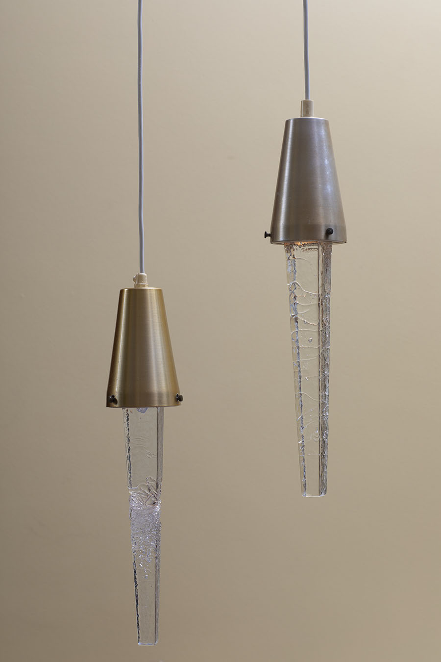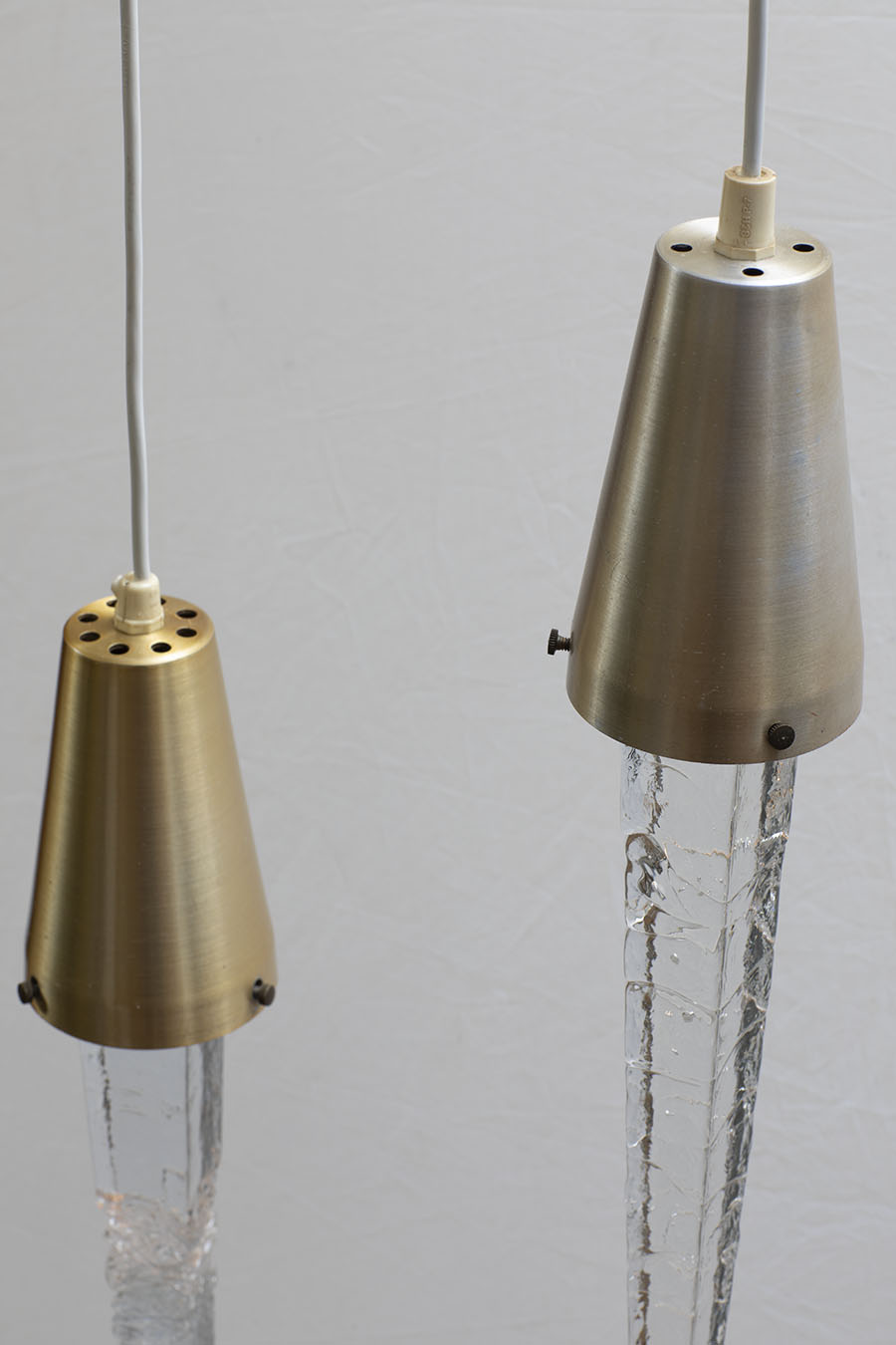 Komplet dwóch lamp vintage. Górny element z aluminium, w kolorze mosiądzu. Szklany sopel, nierówności szkła zamierzone. Stan bardzo dobry, adekwatny do wieku przedmiotów.